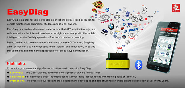 يتميز جهاز EasyDiag بانه يتعامل مع جميع برتوكولات OBD II والتي تدعم سيارات موديل 2002 وما بعدها كما يقوم بكشف الأعطال الخاصة بالموتور وناقل الحركة (الفتيس) ونظام الفرامل ABS ونظام الوسائد الهوائية Air Bag بالإضافة إلى إمكانية شراء السوفت وير الخاص بالـ Car Line او الشركة المصنعة للسيارة والذي يتراوح سعره من بين 39 إلى 79 دولار أمريكي علي ليصبح الجهاز يقوم بنفس اعمال أجهزة مراكز وورش الصيانة في نوع السيارة الذي قمت بشرائه وبجميع موديلات السيارة أي انه في حالة شراء السوفت وير الخاص بشركة BMW فيمكن التعامل بهذا الجهاز علي BMW 316 او BMW 318 او BMW 523 اوي أي موديل اخر من انتاج شركة BMW.